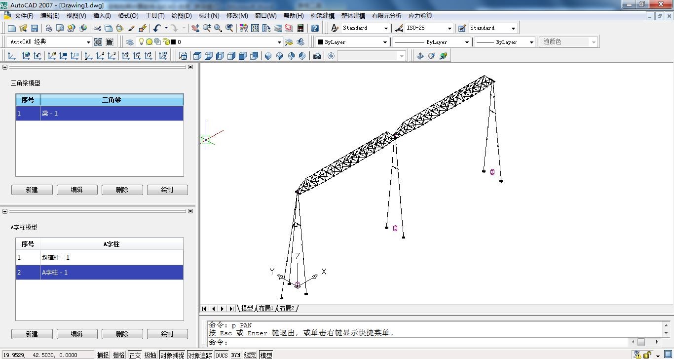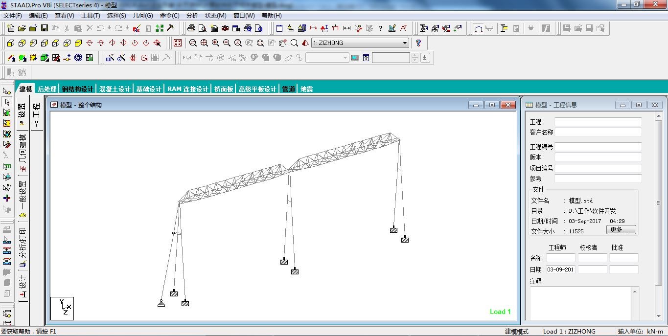 1、构架建模:通过构架的整体建模,并在模型中输入荷载工况,可以迅速的将构架的计算模型搭建完成。