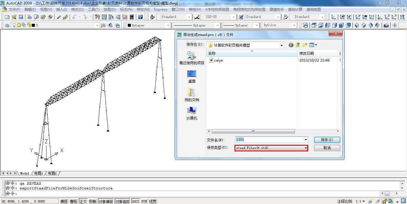 3、模型导出:建模完成后,可以通过软件接口,将模型导出到midas GEN的数据文件(*.mgt),或者将模型导出到staad的数据文件(*.std)。