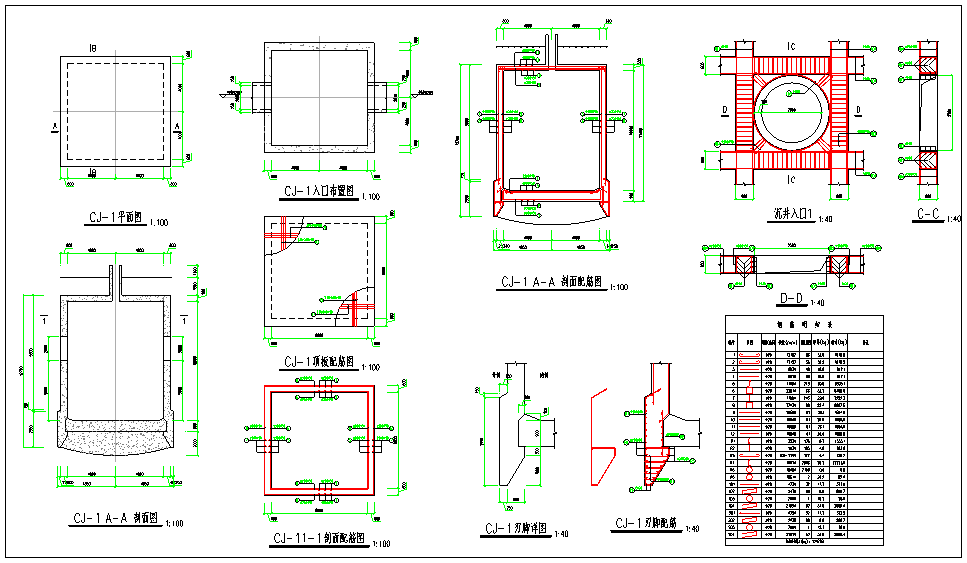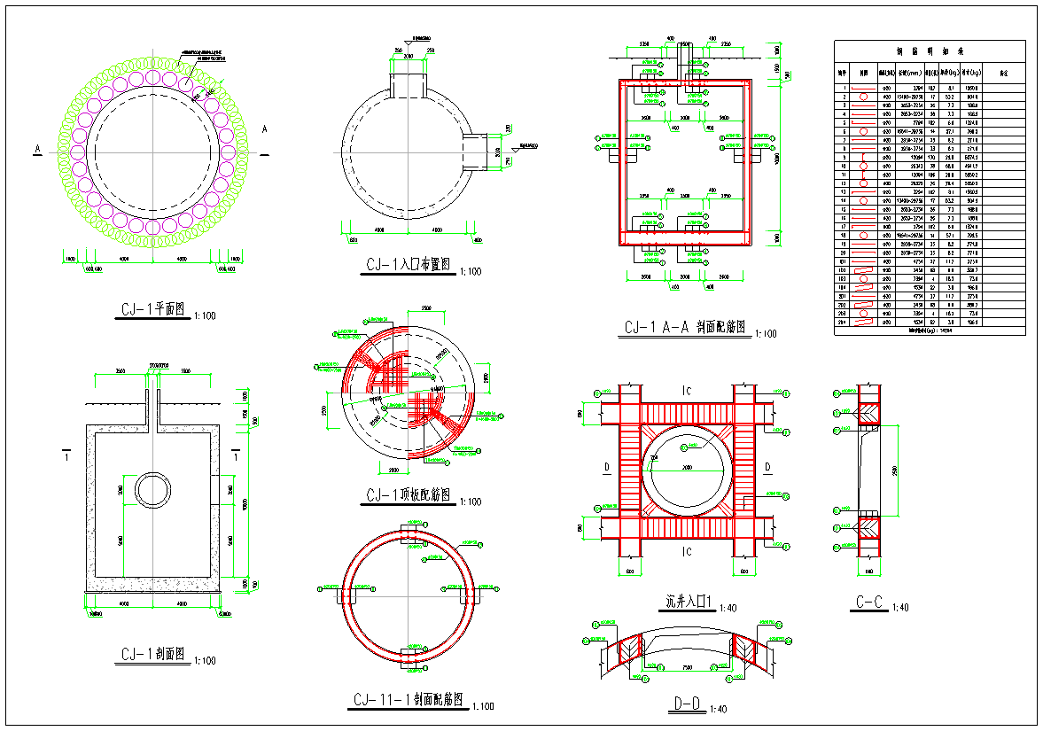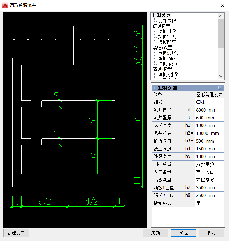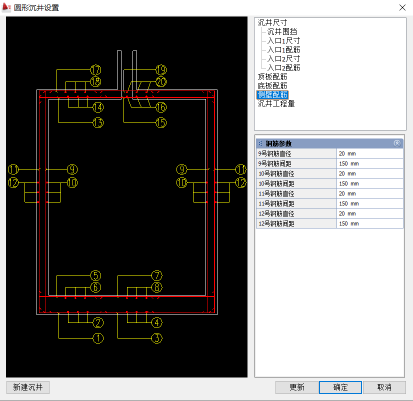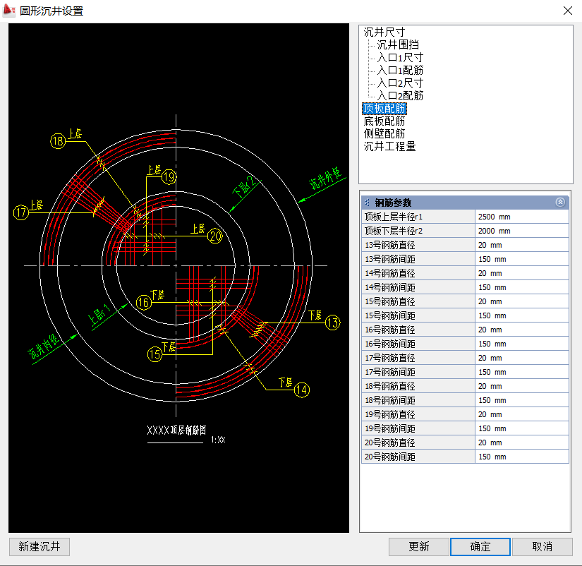 通过上述对话框中参数的设置,点击“新建沉井”的按钮,圆形沉井的绘图工作即可完成,软件在绘图的同时,对所有钢筋进行编号,并绘制钢筋材料表。通过软件绘制的圆形沉井的图形如下: