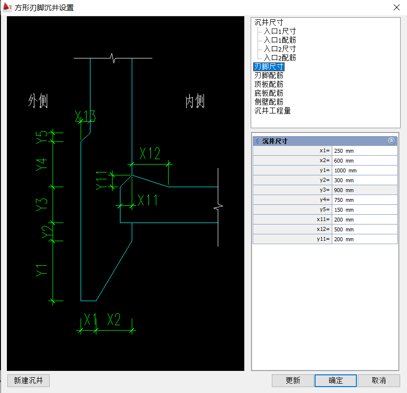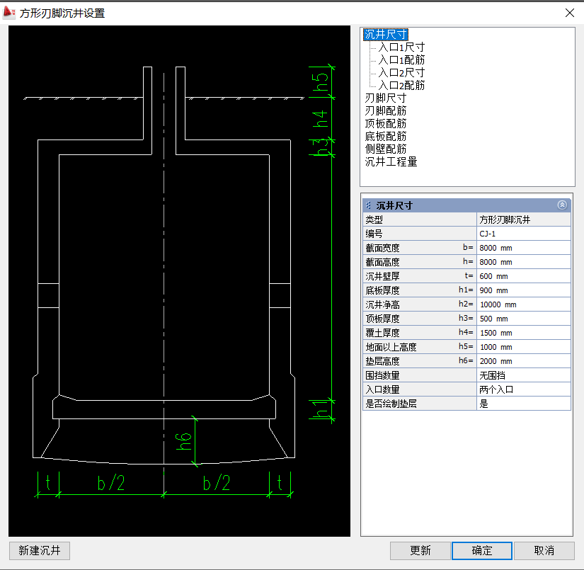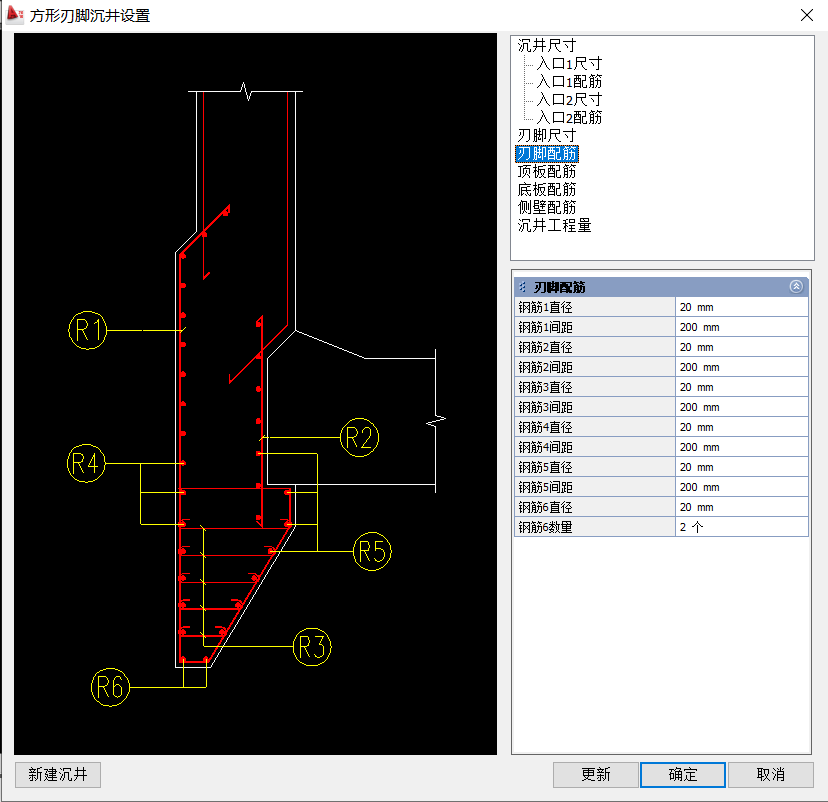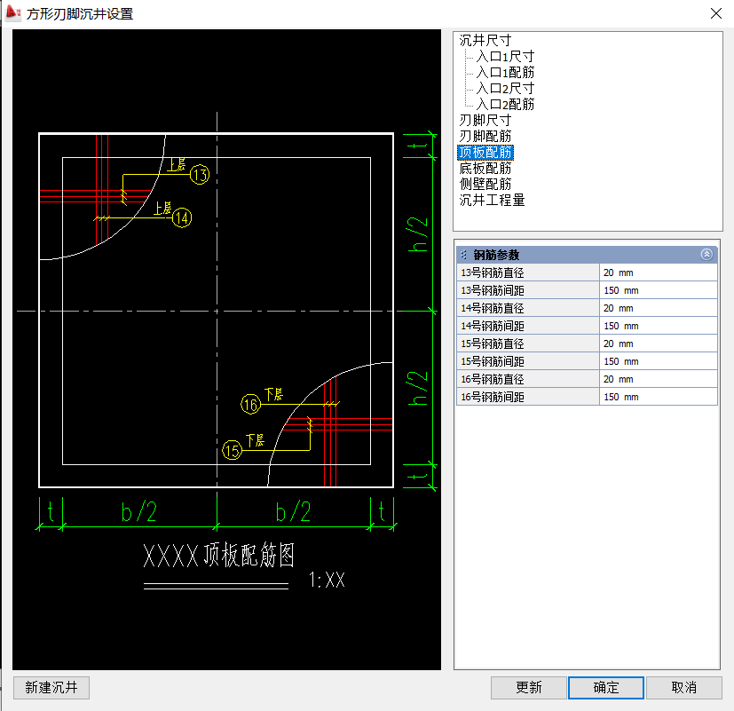 通过上述对话框中参数的设置,点击“新建沉井”的按钮,方形刃脚沉井的绘图工作即可完成,软件在绘图的同时,对所有钢筋进行编号,并绘制钢筋材料表。通过软件绘制的方形刃脚沉井的图形如下: