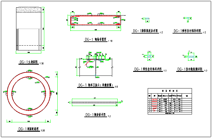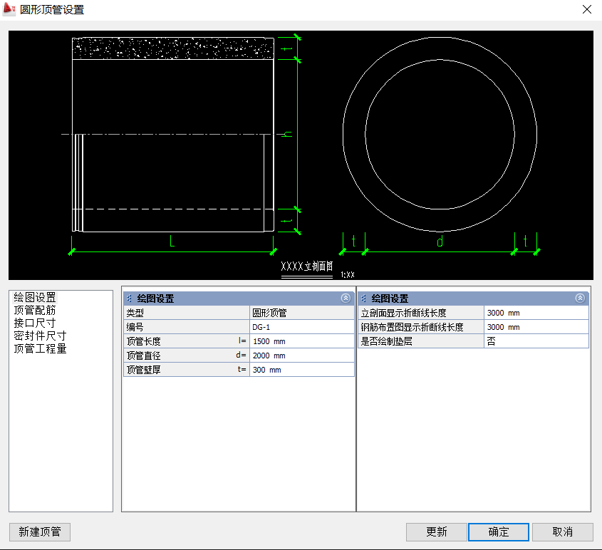 通过上述对话框中参数的设置,点击“新建顶管”的按钮,圆形顶管的绘图工作即可完成,软件在绘图的同时,对所有钢筋进行编号,并绘制钢筋材料表。通过软件绘制的圆形顶管的图形如下: