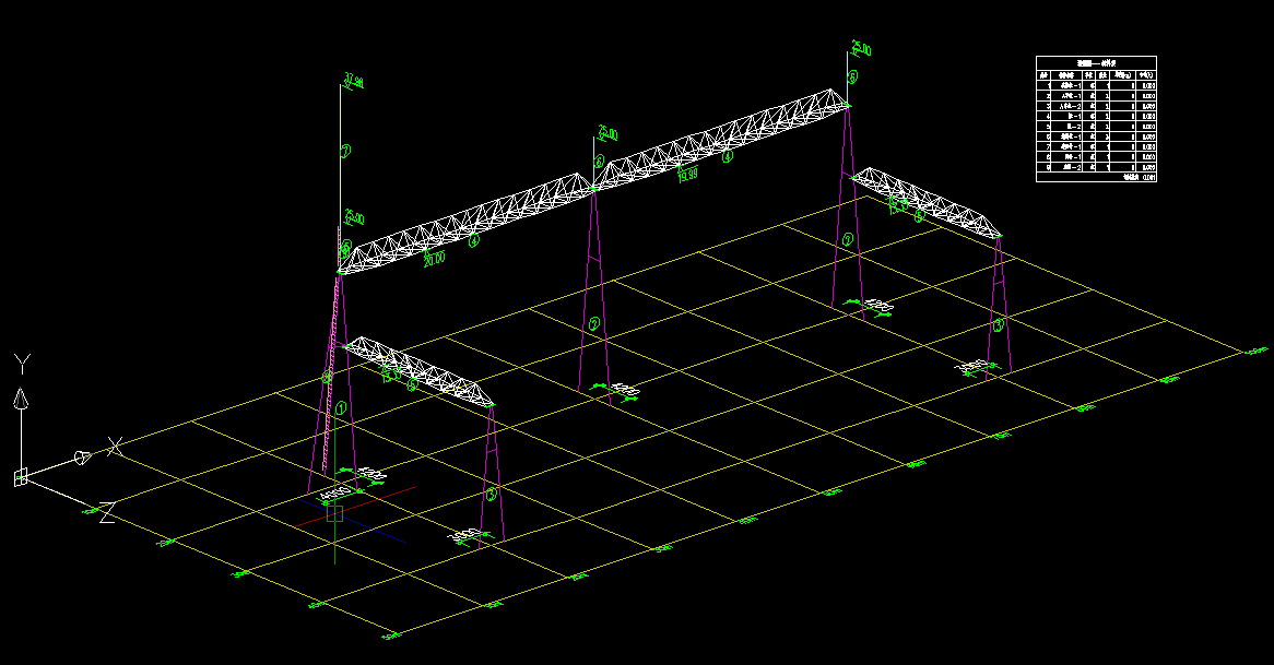 通过上述的菜单,即可完成透视图的绘制,并对所有的构架梁、构架柱、、地线柱、避雷针、爬梯构件进行编号,并绘制材料表。通过软件绘制的透视图的图形如下: