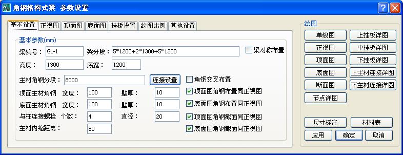 通过上述对话框中参数的设置,点击右侧绘图框内的按钮,角钢格构式构架梁的绘图工作即可完成,软件在绘图的同时,对所有构件进行编号,并绘制材料表。通过软件绘制的角钢格构式构架梁的图形如下: