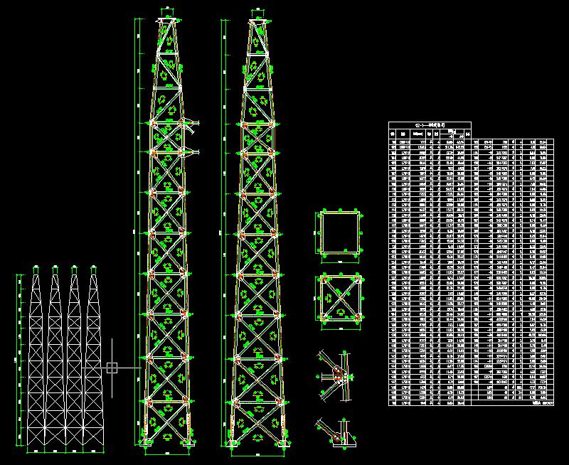 通过上述对话框中参数的设置,点击右侧绘图框内的按钮,角钢格构式构架柱的绘图工作即可完成,软件在绘图的同时,对所有构件进行编号,并绘制材料表。通过软件绘制的角钢格构式构架柱的图形如下: